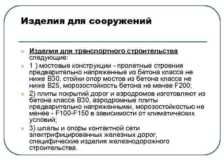 Изделия для сооружений l l Изделия для транспортного строительства следующие: 1 ) мостовые конструкции - пролетные строения предварительно напряженные из бетона класса не ниже В 30, стойки опор мостов из бетона класса не ниже В 25, морозостойкость бетона не менее F 200; 2) плиты покрытий дорог и аэродромов изготовляют из бетона класса В 30, аэродромные плиты предварительно напряженными, морозостойкостью не менее - F 100 -F 150 в зависимости от климатических условий; 3) шпалы и опоры контактной сети электрифицированных железных дорог, специфические изделия железнодорожного строительства.