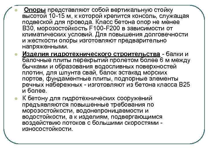 l l l Опоры представляют собой вертикальную стойку высотой 10 -15 м, к которой крепится консоль, служащая подвеской для провода. Класс бетона опор не менее В 30, морозостойкость F 100 -F 200 в зависимости от климатических условий. Для повышения долговечности и жесткости опоры изготовляют предварительно напряженными. Изделия гидротехнического строительства - балки и балочные плиты перекрытий пролетом более 6 м между бычками и образования водосливных поверхностей плотин, для шпунта свай, балок эстакад морских портов, фундаментные плиты, подпорные элементы речных набережных - изготовляют из бетона класса В 25 и более. К бетону для гидротехнических сооружений предъявляются повышенные требования по морозостойкости, водонепроницаемости и водостойкости, а к изделиям, подвергающимся воздействию потоков с большими скоростями - износостойкости.