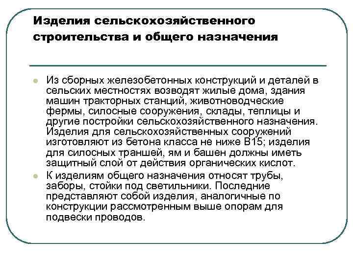Изделия сельскохозяйственного строительства и общего назначения l l Из сборных железобетонных конструкций и деталей в сельских местностях возводят жилые дома, здания машин тракторных станций, животноводческие фермы, силосные сооружения, склады, теплицы и другие постройки сельскохозяйственного назначения. Изделия для сельскохозяйственных сооружений изготовляют из бетона класса не ниже В 15; изделия для силосных траншей, ям и башен должны иметь защитный слой от действия органических кислот. К изделиям общего назначения относят трубы, заборы, стойки под светильники. Последние представляют собой изделия, аналогичные по конструкции рассмотренным выше опорам для подвески проводов.
