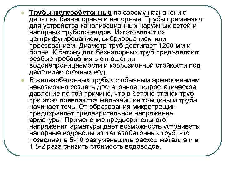 l l Трубы железобетонные по своему назначению делят на безнапорные и напорные. Трубы применяют для устройства канализационных наружных сетей и напорных трубопроводов. Изготовляют их центрифугированием, вибрированием или прессованием. Диаметр труб достигает 1200 мм и более. К бетону для безнапорных труб предъявляют особые требования в отношении водонепроницаемости и коррозионной стойкости под действием сточных вод. В железобетонных трубах с обычным армированием невозможно создать достаточное гидростатическое давление по той причине, что в бетоне стенок труб при этом появляются мельчайшие трещины и труба начинает течь. От образования микротрещин предохраняет предварительное напряжение арматуры. Применение предварительного напряжения арматуры дает возможность устраивать напорные водоводы из железобетонных труб, что позволяет в 5 -10 раз уменьшить расход металла и в 1, 5 -2 раза снизить стоимость водов.