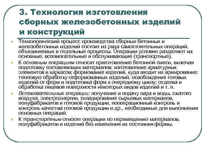 3. Технология изготовления сборных железобетонных изделий и конструкций l l Технологический процесс производства сборных бетонных и железобетонных изделий состоит из ряда самостоятельных операций, объединяемых в отдельные процессы. Операции условно разделяют на основные, вспомогательные и обслуживающие (транспортные). К основным операциям относят приготовление бетонной смеси, включая подготовку составляющих материалов; изготовление арматурных элементов и каркасов; формование изделий, куда входит их армирование; тепловую обработку отформованных изделий, освобождение готовых изделий от форм и подготовка форм к очередному циклу; отделка и обработка лицевой поверхности некоторых видов изделий и т. п. Вспомогательные операции: получение и подачу пара и воды, сжатого воздуха, электроэнергии, складирование сырьевых материалов, полуфабрикатов и готовой продукции, пооперационный контроль и контроль качества готовой продукции и др. , необходимые для выполнения основных операций. К транспортным относят операции по перемещению материалов, полуфабрикатов и изделий без изменения их состояния формы.