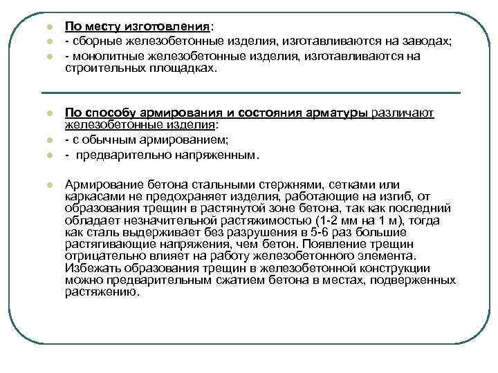 l l l l По месту изготовления: - сборные железобетонные изделия, изготавливаются на заводах; - монолитные железобетонные изделия, изготавливаются на строительных площадках. По способу армирования и состояния арматуры различают железобетонные изделия: - с обычным армированием; - предварительно напряженным. Армирование бетона стальными стержнями, сетками или каркасами не предохраняет изделия, работающие на изгиб, от образования трещин в растянутой зоне бетона, так как последний обладает незначительной растяжимостью (1 -2 мм на 1 м), тогда как сталь выдерживает без разрушения в 5 -6 раз большие растягивающие напряжения, чем бетон. Появление трещин отрицательно влияет на работу железобетонного элемента. Избежать образования трещин в железобетонной конструкции можно предварительным сжатием бетона в местах, подверженных растяжению.