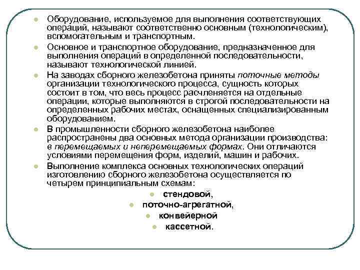 l l l Оборудование, используемое для выполнения соответствующих операций, называют соответственно основным (технологическим), вспомогательным и транспортным. Основное и транспортное оборудование, предназначенное для выполнения операций в определенной последовательности, называют технологической линией. На заводах сборного железобетона приняты поточные методы организации технологического процесса, сущность которых состоит в том, что весь процесс расчленяется на отдельные операции, которые выполняются в строгой последовательности на определенных рабочих местах, оснащенных специализированным оборудованием. В промышленности сборного железобетона наиболее распространены два основных метода организации производства: в перемещаемых и неперемещаемых формах. Они отличаются условиями перемещения форм, изделий, машин и рабочих. Выполнение комплекса основных технологических операций изготовлению сборного железобетона осуществляется по четырем принципиальным схемам: l стендовой, l поточно-агрегатной, l конвейерной l кассетной.