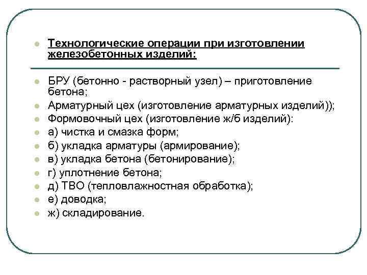 l Технологические операции при изготовлении железобетонных изделий: l БРУ (бетонно - растворный узел) – приготовление бетона; Арматурный цех (изготовление арматурных изделий)); Формовочный цех (изготовление ж/б изделий): а) чистка и смазка форм; б) укладка арматуры (армирование); в) укладка бетона (бетонирование); г) уплотнение бетона; д) ТВО (тепловлажностная обработка); е) доводка; ж) складирование. l l l l l