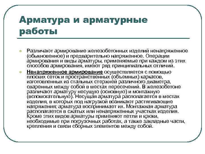 Арматура и арматурные работы l l Различают армирование железобетонных изделий ненапряженное (обыкновенное) и предварительно напряженное. Операции армирования и виды арматуры, применяемые при каждом из этих способов армирования, имеют ряд принципиальных отличий. Ненапряженное армирование осуществляется с помощью плоских сеток и пространственных (объемных) каркасов, изготовленных из стальных стержней различного диаметра, сваренных между собой в местах пересечений. В железобетоне различают арматуру несущую (основную) и монтажную (вспомогательную). Несущая арматура располагается в местах изделия, в которых под нагрузкой возникают растягивающие напряжения; арматура воспринимает их. Монтажная арматура располагается в сжатых или ненапряженных участках изделия. Кроме этих видов арматуры применяют петли и крюки, необходимые при погрузочных работах, а также закладные части, крепления и связи сборных элементов между собой.