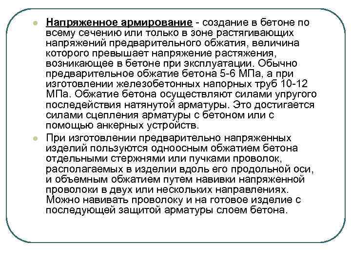 l l Напряженное армирование - создание в бетоне по всему сечению или только в зоне растягивающих напряжений предварительного обжатия, величина которого превышает напряжение растяжения, возникающее в бетоне при эксплуатации. Обычно предварительное обжатие бетона 5 -6 МПа, а при изготовлении железобетонных напорных труб 10 -12 МПа. Обжатие бетона осуществляют силами упругого последействия натянутой арматуры. Это достигается силами сцепления арматуры с бетоном или с помощью анкерных устройств. При изготовлении предварительно напряженных изделий пользуются одноосным обжатием бетона отдельными стержнями или пучками проволок, располагаемых в изделии вдоль его продольной оси, и объемным обжатием путем навивки напряженной проволоки в двух или нескольких направлениях. Можно навивать проволоку и на готовое изделие с последующей защитой арматуры слоем бетона.