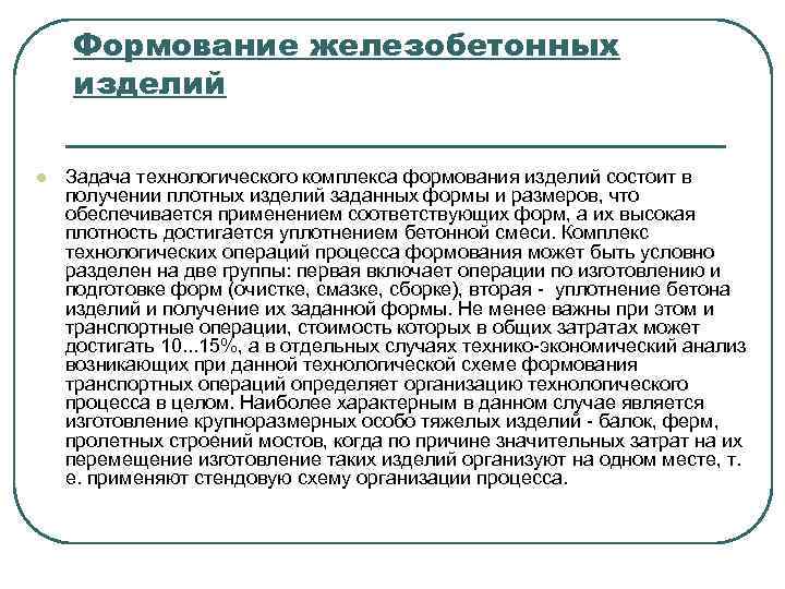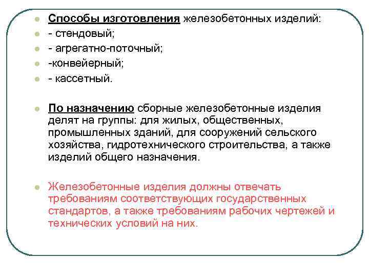 l l l Способы изготовления железобетонных изделий: - стендовый; - агрегатно-поточный; -конвейерный; - кассетный. l По назначению сборные железобетонные изделия делят на группы: для жилых, общественных, промышленных зданий, для сооружений сельского хозяйства, гидротехнического строительства, а также изделий общего назначения. l Железобетонные изделия должны отвечать требованиям соответствующих государственных стандартов, а также требованиям рабочих чертежей и технических условий на них.