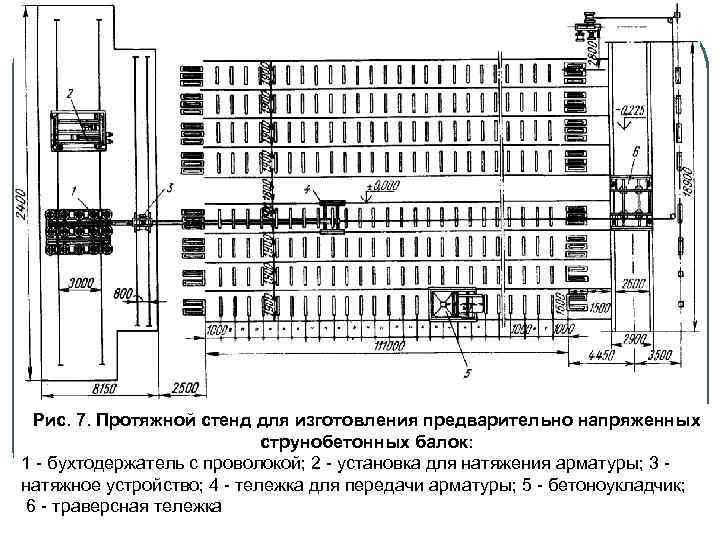 Рис. 7. Протяжной стенд для изготовления предварительно напряженных струнобетонных балок: 1 - бухтодержатель с проволокой; 2 - установка для натяжения арматуры; 3 - натяжное устройство; 4 - тележка для передачи арматуры; 5 - бетоноукладчик; 6 - траверсная тележка