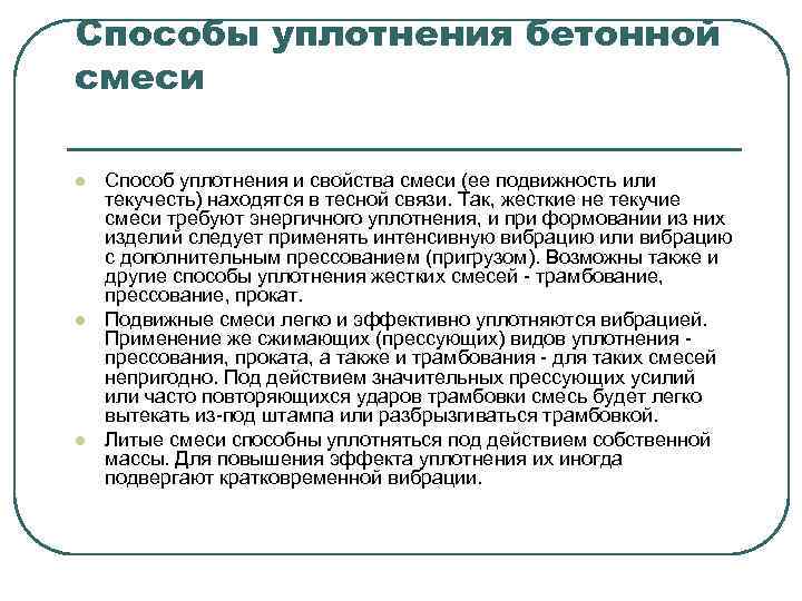 Способы уплотнения бетонной смеси l l l Способ уплотнения и свойства смеси (ее подвижность или текучесть) находятся в тесной связи. Так, жесткие не текучие смеси требуют энергичного уплотнения, и при формовании из них изделий следует применять интенсивную вибрацию или вибрацию с дополнительным прессованием (пригрузом). Возможны также и другие способы уплотнения жестких смесей - трамбование, прессование, прокат. Подвижные смеси легко и эффективно уплотняются вибрацией. Применение же сжимающих (прессующих) видов уплотнения - прессования, проката, а также и трамбования - для таких смесей непригодно. Под действием значительных прессующих усилий или часто повторяющихся ударов трамбовки смесь будет легко вытекать из-под штампа или разбрызгиваться трамбовкой. Литые смеси способны уплотняться под действием собственной массы. Для повышения эффекта уплотнения их иногда подвергают кратковременной вибрации.