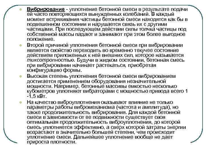 l l Вибрирование - уплотнение бетонной смеси в результате подачи ей часто повторяющихся вынужденных колебаний. В каждый момент встряхивания частицы бетонной смеси находятся как бы в подвешенном состоянии и нарушается связь их с другими частицами. При последующем действии силы толчка частицы под собственной массы падают и занимают при этом более выгодное положение. Второй причиной уплотнения бетонной смеси при вибрировании является свойство переходить во временно текучее состояние действием приложенных к ней внешних сил, которое называется тиксотропностью. Будучи в жидком состоянии, бетонная смесь при вибрировании начинает растекаться, приобретая конфигурацию формы. Высокая степень уплотнения бетонной смеси вибрированием достигается применением оборудования незначительной мощности. Например, бетонные массивы емкостью несколько кубометров уплотняют вибраторами с мощностью привода всего 1 -1, 5 к. Вт. На качество виброуплотнения оказывают влияние не только параметры работы вибромеханизма (частота и амплитуда), но также продолжительность вибрирования. Для каждой бетонной смеси в зависимости от ее подвижности существует своя оптимальная продолжительность виброуплотнения, до которой смесь уплотняется эффективно, а сверх которой затраты энергии возрастают в значительно большей степени, чем происходит уплотнение смеси. Дальнейшее уплотнение вообще не дает прироста плотности.
