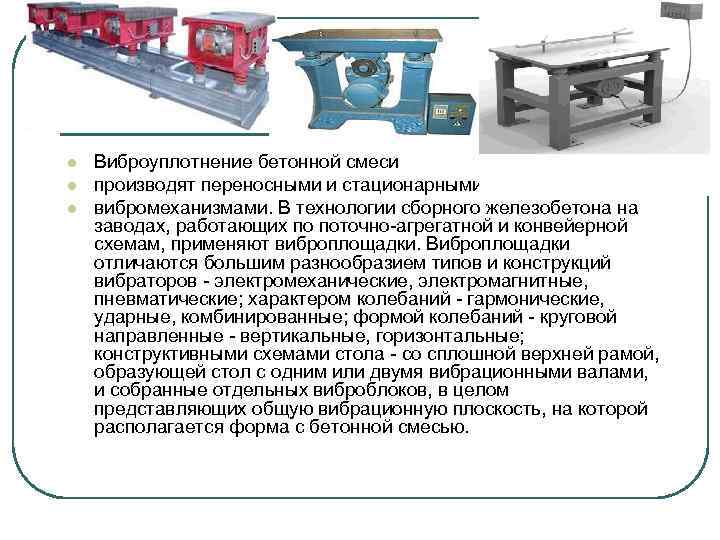 l l l Виброуплотнение бетонной смеси производят переносными и стационарными вибромеханизмами. В технологии сборного железобетона на заводах, работающих по поточно-агрегатной и конвейерной схемам, применяют виброплощадки. Виброплощадки отличаются большим разнообразием типов и конструкций вибраторов - электромеханические, электромагнитные, пневматические; характером колебаний - гармонические, ударные, комбинированные; формой колебаний - круговой направленные - вертикальные, горизонтальные; конструктивными схемами стола - со сплошной верхней рамой, образующей стол с одним или двумя вибрационными валами, и собранные отдельных виброблоков, в целом представляющих общую вибрационную плоскость, на которой располагается форма с бетонной смесью.