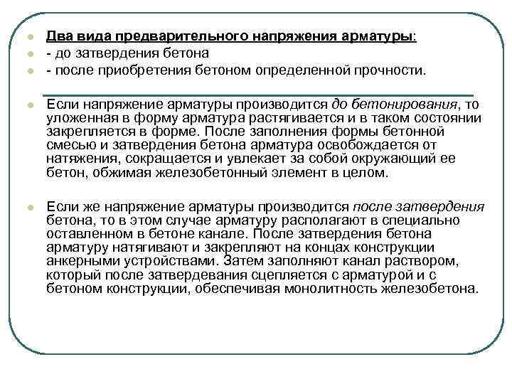 l l l Два вида предварительного напряжения арматуры: - до затвердения бетона - после приобретения бетоном определенной прочности. l Если напряжение арматуры производится до бетонирования, то уложенная в форму арматура растягивается и в таком состоянии закрепляется в форме. После заполнения формы бетонной смесью и затвердения бетона арматура освобождается от натяжения, сокращается и увлекает за собой окружающий ее бетон, обжимая железобетонный элемент в целом. l Если же напряжение арматуры производится после затвердения бетона, то в этом случае арматуру располагают в специально оставленном в бетоне канале. После затвердения бетона арматуру натягивают и закрепляют на концах конструкции анкерными устройствами. Затем заполняют канал раствором, который после затвердевания сцепляется с арматурой и с бетоном конструкции, обеспечивая монолитность железобетона.