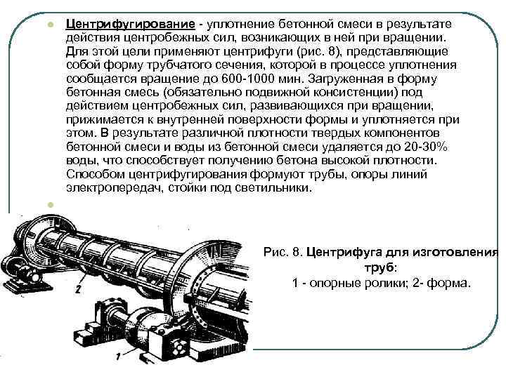 l l Центрифугирование - уплотнение бетонной смеси в результате действия центробежных сил, возникающих в ней при вращении. Для этой цели применяют центрифуги (рис. 8), представляющие собой форму трубчатого сечения, которой в процессе уплотнения сообщается вращение до 600 -1000 мин. Загруженная в форму бетонная смесь (обязательно подвижной консистенции) под действием центробежных сил, развивающихся при вращении, прижимается к внутренней поверхности формы и уплотняется при этом. В результате различной плотности твердых компонентов бетонной смеси и воды из бетонной смеси удаляется до 20 -30% воды, что способствует получению бетона высокой плотности. Способом центрифугирования формуют трубы, опоры линий электропередач, стойки под светильники. Рис. 8. Центрифуга для изготовления труб: 1 - опорные ролики; 2 - форма.