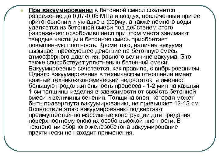 l При вакуумировании в бетонной смеси создается разрежение до 0, 07 -0, 08 МПа и воздух, вовлеченный при ее приготовлении и укладке в форму, а также немного воды удаляется из бетонной смеси под действием этого разрежения: освободившиеся при этом места занимают твердые частицы и бетонная смесь приобретает повышенную плотность. Кроме того, наличие вакуума вызывает прессующее действие на бетонную смесь атмосферного давления, равного величине вакуума. Это также способствует уплотнению бетонной смеси. Вакуумирование сочетается, как правило, с вибрированием. Однако вакуумирование в техническом отношении имеет важный технико-экономический недостаток, а именно: большую продолжительность процесса - 1 -2 мин на каждый 1 см толщины изделия в зависимости от свойств бетонной смеси и величины сечения. Толщина слоя, которая может быть подвергнута вакуумированию, не превышает 12 -15 см. Вследствие этого вакуумированию подвергают преимущественно массивные конструкции для придания поверхностному слою их особо высокой плотности. В технологии сборного железобетона вакуумирование практически не находит применения.