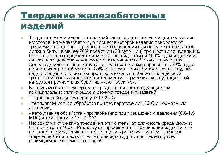 Твердение железобетонных изделий l l l Твердение отформованных изделий - заключительная операция технологии изготовления железобетона, в процессе которой изделия приобретают требуемую прочность. Прочность бетона изделий при отгрузке потребителю должна быть не менее 70% проектной (28 -суточной) прочности для изделий из бетона на портландцементе или его разновидностях и 100% - для изделий из силикатного (известково-песчаного) или ячеистого бетона. Однако для железнодорожных шпал отпускная прочность должна превышать 70% и для пролетных строений мостов - 80% от класса. При этом имеется в виду, что недостающую до проектной прочность изделия наберут в процессе их транспортирования и монтажа и к моменту нагружения эксплуатационной нагрузкой прочность их будет не ниже проектной. В зависимости от температуры среды различают следующие три принципиально отличающихся режима твердения изделий: - нормальный при температуре 15 -20°С; - тепловлажностная обработка при температуре до 100°С и нормальном давлении; - автоклавная обработка - пропаривание при повышенном давлении (0, 8 -1, 5 МПа) и температуре 174 -200°С. Независимо от режима твердения относительная влажность среды должна быть близкой к 100%. Иначе будет происходить высушивание изделий, что приведет к замедлению или прекращению роста их прочности, так как твердение бетона есть в первую очередь гидратация цемента, т. е. взаимодействие цемента с водой.