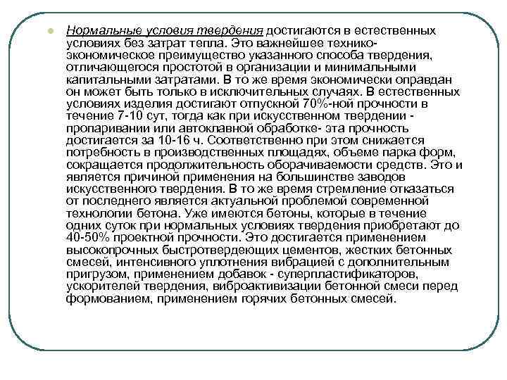 l Нормальные условия твердения достигаются в естественных условиях без затрат тепла. Это важнейшее техникоэкономическое преимущество указанного способа твердения, отличающегося простотой в организации и минимальными капитальными затратами. В то же время экономически оправдан он может быть только в исключительных случаях. В естественных условиях изделия достигают отпускной 70%-ной прочности в течение 7 -10 сут, тогда как при искусственном твердении - пропаривании или автоклавной обработке- эта прочность достигается за 10 -16 ч. Соответственно при этом снижается потребность в производственных площадях, объеме парка форм, сокращается продолжительность оборачиваемости средств. Это и является причиной применения на большинстве заводов искусственного твердения. В то же время стремление отказаться от последнего является актуальной проблемой современной технологии бетона. Уже имеются бетоны, которые в течение одних суток при нормальных условиях твердения приобретают до 40 -50% проектной прочности. Это достигается применением высокопрочных быстротвердеющих цементов, жестких бетонных смесей, интенсивного уплотнения вибрацией с дополнительным пригрузом, применением добавок - суперпластификаторов, ускорителей твердения, виброактивизации бетонной смеси перед формованием, применением горячих бетонных смесей.