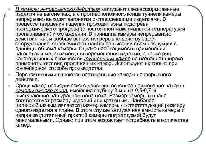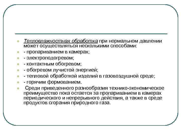 l l l l Тепловлажностная обработка при нормальном давлении может осуществляться несколькими способами: - пропариванием в камерах; - электроподогревом; - контактным обогревом; - обогревом лучистой энергией; - тепловой обработкой изделий в газовоздушной среде; - горячим формованием. Среди приведенного разнообразия технико-экономическое преимущество пока остается за пропариванием в камерах периодического и непрерывного действия, а также в среде продуктов сгорания природного газа.