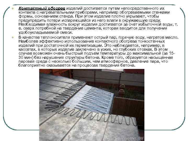 l l Контактный обогрев изделий достигается путем непосредственного их контакта с нагревательными приборами, например обогреваемыми стенками формы, основанием стенда. При этом изделие плотно укрывают, чтобы предупредить потери испаряющейся из него влаги в окружающую среду. Необходимая влажность вокруг изделия достигается за счет избыточной воды, т. е. сверх потребной на твердение цемента, которая вводится для получения удобоукладываемой смеси. В качестве теплоносителя применяют острый пар, горячую воду, нагретое масло. Наиболее эффективно использование контактного обогрева тонкостенных изделий при достаточной их герметизации. Это наблюдается, например, в кассетах, в которых изделие заключено в узких, но глубоких отсеках. В этом случае возможен очень быстрый подъем температуры до максимальной (за 1530 мин) без нарушения структуры бетона. Кроме того, образуется насыщенная паровая среда с несколько большим, чем атмосферное, давление пара, что благоприятно сказывается на процессах твердения бетона.