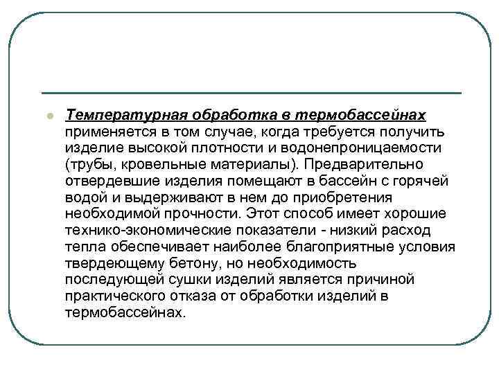l Температурная обработка в термобассейнах применяется в том случае, когда требуется получить изделие высокой плотности и водонепроницаемости (трубы, кровельные материалы). Предварительно отвердевшие изделия помещают в бассейн с горячей водой и выдерживают в нем до приобретения необходимой прочности. Этот способ имеет хорошие технико-экономические показатели - низкий расход тепла обеспечивает наиболее благоприятные условия твердеющему бетону, но необходимость последующей сушки изделий является причиной практического отказа от обработки изделий в термобассейнах.