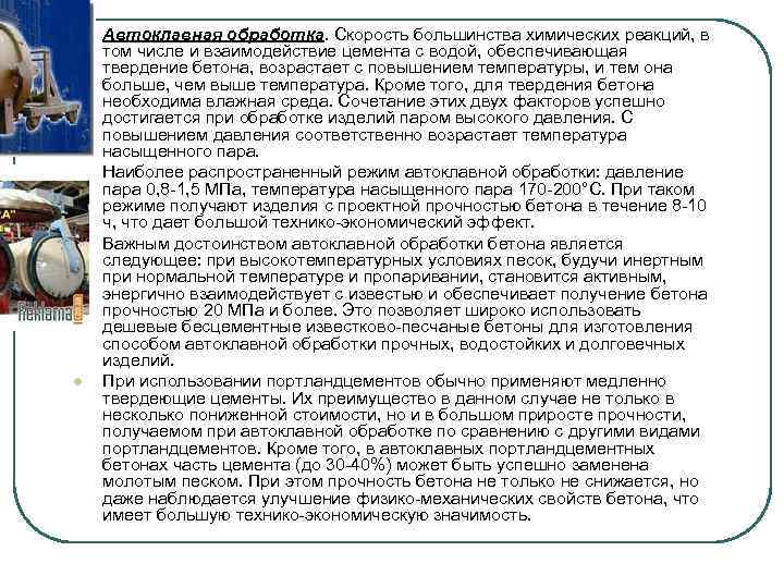 l l Автоклавная обработка. Скорость большинства химических реакций, в том числе и взаимодействие цемента с водой, обеспечивающая твердение бетона, возрастает с повышением температуры, и тем она больше, чем выше температура. Кроме того, для твердения бетона необходима влажная среда. Сочетание этих двух факторов успешно достигается при обработке изделий паром высокого давления. С повышением давления соответственно возрастает температура насыщенного пара. Наиболее распространенный режим автоклавной обработки: давление пара 0, 8 -1, 5 МПа, температура насыщенного пара 170 -200°С. При таком режиме получают изделия с проектной прочностью бетона в течение 8 -10 ч, что дает большой технико-экономический эффект. Важным достоинством автоклавной обработки бетона является следующее: при высокотемпературных условиях песок, будучи инертным при нормальной температуре и пропаривании, становится активным, энергично взаимодействует с известью и обеспечивает получение бетона прочностью 20 МПа и более. Это позволяет широко использовать дешевые бесцементные известково-песчаные бетоны для изготовления способом автоклавной обработки прочных, водостойких и долговечных изделий. При использовании портландцементов обычно применяют медленно твердеющие цементы. Их преимущество в данном случае не только в несколько пониженной стоимости, но и в большом приросте прочности, получаемом при автоклавной обработке по сравнению с другими видами портландцементов. Кроме того, в автоклавных портландцементных бетонах часть цемента (до 30 -40%) может быть успешно заменена молотым песком. При этом прочность бетона не только не снижается, но даже наблюдается улучшение физико-механических свойств бетона, что имеет большую технико-экономическую значимость.