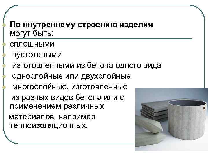 По внутреннему строению изделия могут быть: l сплошными l пустотелыми l изготовленными из бетона одного вида l однослойные или двухслойные l многослойные, изготовленные из разных видов бетона или с применением различных материалов, например теплоизоляционных. l