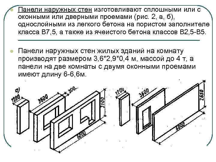 l Панели наружных стен изготовливают сплошными или с оконными или дверными проемами (рис. 2, а, б), однослойными из легкого бетона на пористом заполнителе класса В 7, 5, а также из ячеистого бетона классов В 2, 5 -В 5. l Панели наружных стен жилых зданий на комнату производят размером 3, 6*2, 9*0, 4 м, массой до 4 т, а панели на две комнаты с двумя оконными проемами имеют длину 6 -6, 6 м.