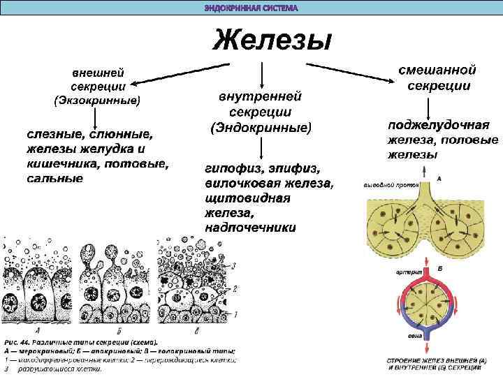 Железы, их функции. Эндокринная система регуляции деятельности внутренних органов посредством гормонов, выделяемых эндокринными клетками непосредственно в кровь, либо диффундирующих через межклеточное пространство в соседние клетки. Роль эндокринных желез в организме – нормализация работы нервной и иммунной систем, поддержание нормального кислотно-основного состояния организма. Железами внутренней секреции совместно образуется гландулярная часть системы, которая производит особые соединения — гормоны. В основном железы внутренней секреции состоят из стромы и паренхимы. Железы внутренней секреции иннервируются вегетативной нервной системой. Различают три группы гормонов: 1. гормоны, которые оказывают влияние непосредственно на орган-мишень — эффектроные гормоны; 2. 2. гормоны, которые регулируют синтез и выделение эффекторных гормонов — гормоны тропные или гландотропные; 3. 3. гормоны, выделяемые нервными клетками в гипоталамусе — нейрогормоны, эти гормоны регулируют синтез и выделение гормонов (преимущественно тропных) аденогипофиза. По химической структуре гормоны подразделяют на белковые, или полипептидные (инсулин, соматостатин), стероидные, или липидные (половые гормоны), и производные аминокислот (адреналин, норадреналин, тироксин).