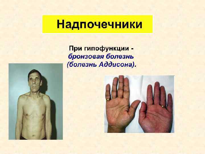 Повышенная функция Норма Кортикостероиды Андрогены эстрогены Андреналин, норадреналин Участвуют в обеспечении иммунитета, адаптации. Регулируют все виды обмена веществ Влияют на формирование вторичных половых признаков Снижается обмен веществ, устойчивость организма к неблагоприятным факторам Раннее половое созревание. Быстрое прекращение роста Увеличивают силу и частоту сердечных сокращений. Повышают кровяное давление. Усиливают обмен веществ, особенно углеводов. Учащается сердцебиение. Резко повышается кровяное давление. Повышенная возбудимость Пониженная функция Адиссонова болезнь: мышечная слабость, одышка, бронзовый оттенок кожи Позднее половое созревание