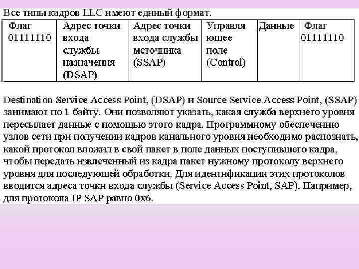 Кадр Ethernet Заголовок Ethernet Кадр LLC Протокол LLC занимает уровень между сетевым уровнем и протоколами уровня МАС Протокол LLC помещает пакет протокола верхнего уровня в свой кадр, который дополняется служебными полями МАС Далее через межуровневый интерфейс протокол LLC передает свой кадр вместе с адресной информацией об узле назначения соответствующему протоколу уровня МАС, который упаковывает кадр LLC в свой кадр