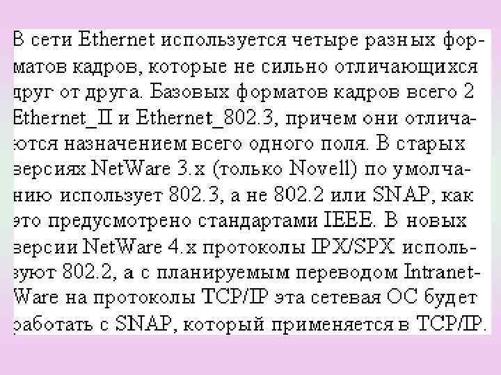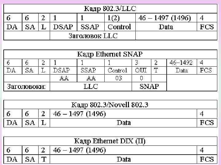 Кадрлар форматтары Кадрлар форматтындағы айырмашылықтар кейде тек бір стандартқа ғана есептелген аппаратураның үйлесімсіздігіне әкелуі мүмкін, бірақ көптеген желілік адаптерлер, көпірлер және маршрутизаторлар Ethernet технологиясының практикада қолданылатын барлық кадрлар форматтарымен жұмыс жасай алады. -802. 3/LLC кадры (немесе Novell 802. 2 кадры); -Raw 802. 3 кадры (немесе Novell 802. 3 кадры); -Ethernet DIX кадры (немесе Ethernet II кадры); -Ethernet SNAP.