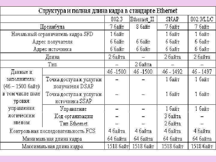 Ең төменгі минимальды кадр ұзындығы барлық Ethernet кадрларлары түрлеріне 64 байт, ал максимальды – 1518 байт. CSMA/CD. Тарату ортасына рұқсат әдісі (Метод доступа к среде передачи) - тасушыны табуы бар көптік рұқсатын қолданады (множественный доступ с контролем несущей и обнаружением конфликтов)