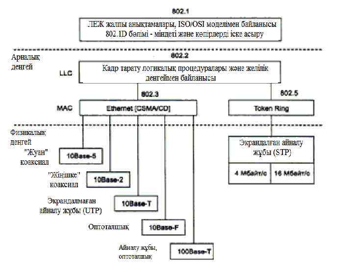 MAC деңгейі. Сол немесе басқа байланыс стансаның басқаруындағы белгілі алгоритммен сәйкес жалпы ортаны тура үйлесімді қолдануды қамтамасыз етеді. Ортаға рұқсат алған соң, оны одан да жоғары деңгей қолдануы мүмкін - мәліметтерді, транспортты қызметтің әр түрлі деңгейі бар ақпарат кадрларының логикалық бірліктерін таратуды қамтамасыз ететін LLC деңгейі әр түрлі деңгейлі сенімділігі бар түйіндер арасында мәліметтер кадрын таратуға жауап береді, сондайақ интерфейс пен оған қосымша желілік деңгейдің функциясын іске асырады.
