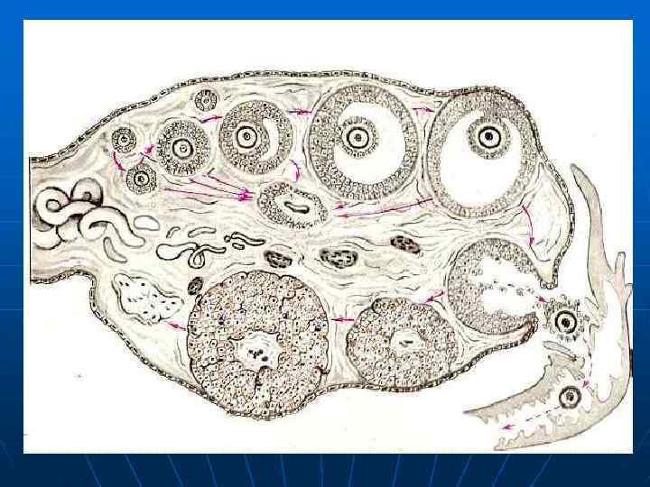 ФОЛЛИКУЛОГЕНЕЗ Фолликул состоит из половой клетки (овоцита) и окружающих его оболочек. В процессе развития фолликул проходит следующие стадии: примордиальный → первичный → вторичный → третичный (пузырчатый)