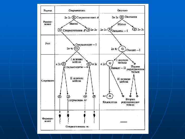 Признаки Сперматогенез Овогенез Временные границы периода размножения от момента полового созревания и почти до конца жизни начинается в эмбриогенезе и затухает к моменту рождения Период роста умеренное преобладание накопление значительных анаболизма над катаболизмом кол-в липидов, белков, РНК Период созревания обычный в результате образуется 1 яйцеклетка и 3 редукционных тельца (для сбережения питательных веществ) Период формирования имеется отсутствует Число гамет из 1 сперматогонии В – 4 сперматозоида из одного овоцита I порядка – 1 яйцеклетка Кариотипическая характеристика гамет неоднородны по половой хромосоме Генетическая характеристика гамет каждая гамета генетически уникальна Общая продуктивность около 500 млрд за репродуктивный период (у человека) около 300 -400 за репродуктивный период (у человека)