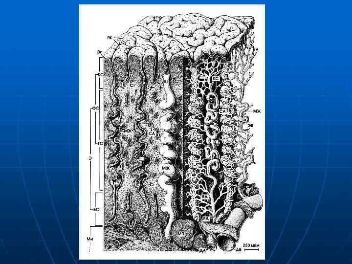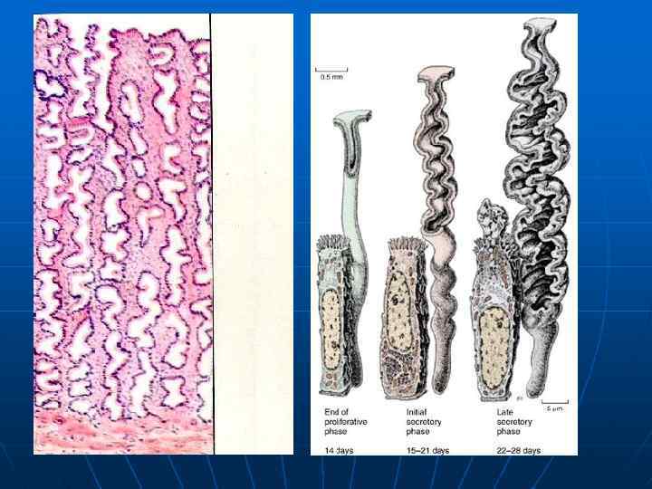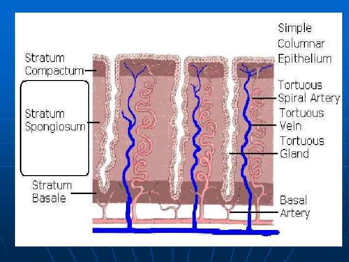 • В слизистой оболочке имеется два слоя: базальный (содержит донышки маточных желез) и функциональный (включает в себя тело и шейку желез, а также поверхностный эпителий). • Особенности микрососудистого русла эндометрия: пришедшие из мышечной оболочки прямые артерии разветляются на прямые артериолы; отходящие от них капилляры кровоснабжают ткани базального слоя; на границе базального и функционального слоев прямые артериолы переходят в штопорообразные извитые артериолы, обеспечивающие кровью структурные компоненты функционального слоя; в месте перехода прямых артериол в извитые имеется сфинктер, гладкие миоциты которого отличаются высокой чувствительностью к половых гормонам.
