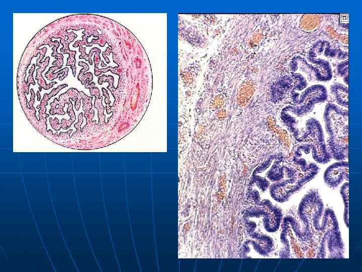 Маточные трубы (яйцеводы) • Функции: захват овоцита (после овуляции, с поверхности яичника), создание условий для продвижения сперматозоидов из матки в полость труб, обеспечение благоприятной среды для оплодотворения и ранних стадий эмбриогенеза, продвижение зародыша в матку. • Морфология: - Парный цилиндрический орган длиной 10 -12 см. - Имеется два отверстия: одно открывается в матку, другое в брюшную полость. - В органе различают маточную часть, перешеек, ампулу и воронку, снабженную бахромками. - Стенка состоит из трех оболочек: серозной, мышечной (два слоя гладких мышц) и слизистой; последняя образует многочисленные выросты (складки) неправильной формы и покрыта однослойным цилиндрическим эпителием (реснитчатые и секреторные клетки), под которым залегает соединительнотканная пластинка.