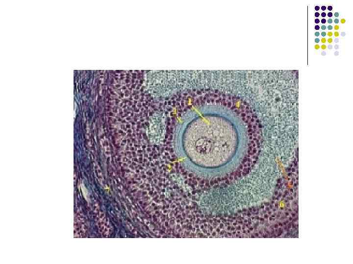 Фолликулы яичника l l Примордиальные – многочисленные, содержат мелкий овоцит и плоские фолликулярные клетки Первичные – первичный овоцит и слой призматических фолликулярных клеток, имеется прозрачная оболочка Вторичные – первиный овоцит, многослойная фолликулярная оболочка (ФСГ), формируется тека Третичные (пузырчатые) – фолликулярные клетки вырабатывают эстрогены