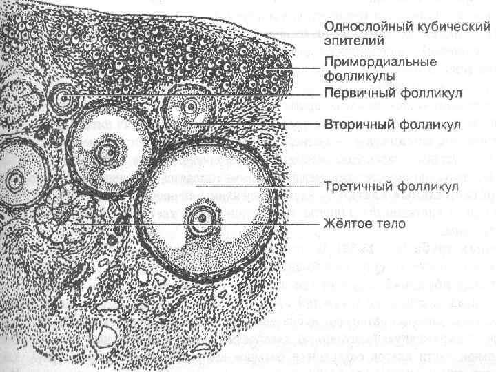 фолликулы Различают 4 вида фолликулов: примордиальные, первичные, вторичные, третичные, или граафовы пузырьки. содержат одну женскую половую клетку, а также фолликулярные клетки эпителиальной природы. Которые лежат на базальной мембране, окружающей фолликулярный эпителий с наружной стороны.