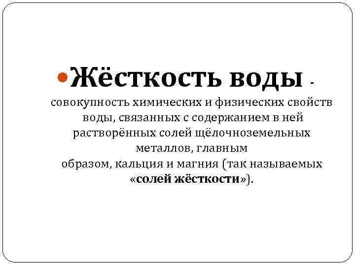 Жёсткость воды совокупность химических и физических свойств воды, связанных с содержанием в ней растворённых солей щёлочноземельных металлов, главным образом, кальция и магния (так называемых «солей жёсткости» ).