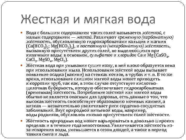 Жесткая и мягкая вода Вода с большим содержанием таких солей называется жёсткой, с малым содержанием — мягкой. Различают временную (карбонатную) жёсткость, обусловленную гидрокарбонатами кальция и магния (Са(НСО 3)2; Mg(НСО 3)2), и постоянную (некарбонатную) жёсткость, вызванную присутствием других солей, не выделяющихся при кипячении воды: в основном, сульфатов и хлоридов Са и Mg (Ca. SO 4, Ca. Cl 2, Mg. SO 4, Mg. Cl 2). Жёсткая вода при умывании сушит кожу, в ней плохо образуется пена при использовании мыла. Использование жёсткой воды вызывает появление осадка (накипи) на стенках котлов, в трубах и т. п. В то же время, использование слишком мягкой воды может приводить к коррозии труб, так как, в этом случае отсутствует кислотнощелочная буферность, которую обеспечивает гидрокарбонатная (временная) жёсткость. Потребление жёсткой или мягкой воды обычно не является опасным для здоровья, есть данные о том, что высокая жёсткость способствует образованию мочевых камней, а низкая — незначительно увеличивает риск сердечно-сосудистых заболеваний. Вкус природной питьевой воды, например, воды родников, обусловлен именно присутствием солей жёсткости. Жёсткость природных вод может варьироваться в довольно широких пределах и в течение года непостоянна. Увеличивается жёсткость изза испарения воды, уменьшается в сезон дождей, а также в период таяния снега и льда.