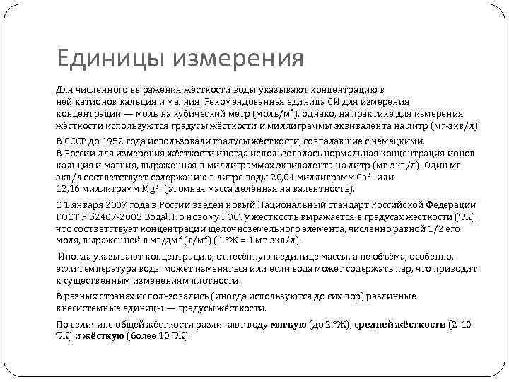 Единицы измерения Для численного выражения жёсткости воды указывают концентрацию в ней катионов кальция и магния. Рекомендованная единица СИ для измерения концентрации — моль на кубический метр (моль/м³), однако, на практике для измерения жёсткости используются градусы жёсткости и миллиграммы эквивалента на литр (мг-экв/л). В СССР до 1952 года использовали градусы жёсткости, совпадавшие с немецкими. В России для измерения жёсткости иногда использовалась нормальная концентрация ионов кальция и магния, выраженная в миллиграммах эквивалента на литр (мг-экв/л). Один мгэкв/л соответствует содержанию в литре воды 20, 04 миллиграмм Ca 2+ или 12, 16 миллиграмм Mg 2+ (атомная масса делённая на валентность). С 1 января 2007 года в России введен новый Национальный стандарт Российской Федерации ГОСТ Р 52407 -2005 Вода]. По новому ГОСТу жесткость выражается в градусах жесткости (°Ж), что соответствует концентрации щелочноземельного элемента, численно равной 1/2 его моля, выраженной в мг/дм³ (г/м³) (1 °Ж = 1 мг-экв/л). Иногда указывают концентрацию, отнесённую к единице массы, а не объёма, особенно, если температура воды может изменяться или если вода может содержать пар, что приводит к существенным изменениям плотности. В разных странах использовались (иногда используются до сих пор) различные внесистемные единицы — градусы жёсткости. По величине общей жёсткости различают воду мягкую (до 2 °Ж), средней жёсткости (2 -10 °Ж) и жёсткую (более 10 °Ж).