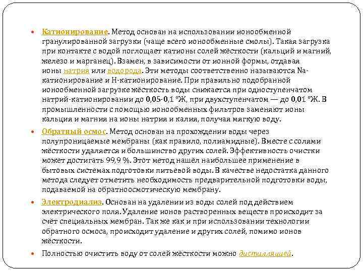 Катионирование. Метод основан на использовании ионообменной гранулированной загрузки (чаще всего ионообменные смолы). Такая загрузка при контакте с водой поглощает катионы солей жёсткости (кальций и магний, железо и марганец). Взамен, в зависимости от ионной формы, отдавая ионы натрия или водорода. Эти методы соответственно называются Naкатионирование и Н-катионирование. При правильно подобранной ионообменной загрузке жёсткость воды снижается при одноступенчатом натрий-катионировании до 0, 05 -0, 1 °Ж, при двухступенчатом — до 0, 01 °Ж. В промышленности с помощью ионообменных фильтров заменяют ионы кальция и магния на ионы натрия и калия, получая мягкую воду. Обратный осмос. Метод основан на прохождении воды через полупроницаемые мембраны (как правило, полиамидные). Вместе с солями жёсткости удаляется и большинство других солей. Эффективность очистки может достигать 99, 9 %. Этот метод нашёл наибольшее применение в бытовых системах подготовки питьевой воды. В качестве недостатка данного метода следует отметить необходимость предварительной подготовки воды, подаваемой на обратноосмотическую мембрану. Электродиализ. Основан на удалении из воды солей под действием электрического поля. Удаление ионов растворенных веществ происходит за счёт специальных мембран. Так же как и при использовании технологии обратного осмоса, происходит удаление и других солей, помимо ионов жёсткости. Полностью очистить воду от солей жёсткости можно дистилляцией.