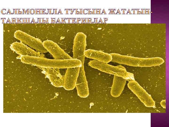 ЭТИОЛОГИЯСЫ: Salmonella тобының қоздырғыштары Enterobacteriacea туыстығына жатады. Грам теріс, спора түзбейтін, майда таяқшалар. Жай қоректік ортада жақсы өсіп-өнеді. Суда 2 -5 айға дейін, топырақта 4 -6 айға дейін, бөлме шаңында 3 айға дейін ал құрғақ нәжіс құрамында 2 -4 жылға дейін сақтала –ды. Ет пен шұжықта 2 -4 ай, сары майда 4 ай, сүтте 20 күн сақталады. Құрамында соматикалық ыстыққа төзімді О-антигені және талшықты ыстыққа төзімсіз Н-антигені бар. 60 -қа жуық түрге бөлінеді. Ал талшықты Н-антигені бойынша 2000 -нан астам сероварлары бар. Сальмонелла қоздырғыштары қоршаған ортада өте тұрақты.
