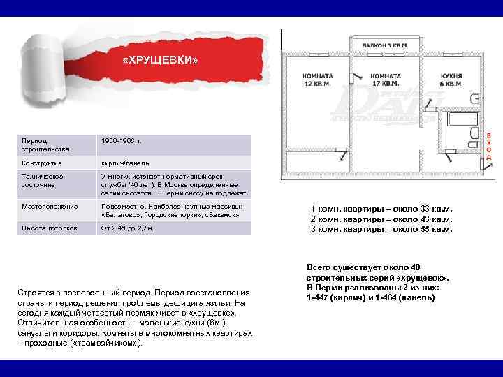 «ХРУЩЕВКИ» Период 1950 -1968 гг. строительства Конструктив кирпич/панель Техническое У многих истекает нормативный срок состояние службы (40 лет). В Москве определенные серии сносятся. В Перми сносу не подлежат. Местоположение Повсеместно. Наиболее крупные массивы: 1 комн. квартиры – около 33 кв. м. «Балатово» , Городские горки» , «Закамск» . 2 комн. квартиры – около 43 кв. м. Высота потолков От 2, 48 до 2, 7 м. 3 комн. квартиры – около 55 кв. м. Всего существует около 40 строительных серий «хрущевок» . В Перми реализованы 2 из них: Строятся в послевоенный период. Период восстановления 1 -447 (кирпич) и 1 -464 (панель) страны и период решения проблемы дефицита жилья. На сегодня каждый четвертый пермяк живет в «хрущевке» . Отличительная особенность – маленькие кухни (6 м. ), санузлы и коридоры. Комнаты в многокомнатных квартирах – проходные ( «трамвайчиком» ).