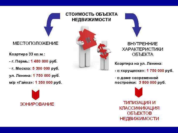 СТОИМОСТЬ ОБЪЕКТА НЕДВИЖИМОСТИ МЕСТОПОЛОЖЕНИЕ ВНУТРЕННИЕ ХАРАКТЕРИСТИКИ Квартира 33 кв. м. : ОБЪЕКТА - г. Пермь: 1 480 000 руб. Квартира на ул. Ленина: - г. Москва: 5 300 000 руб. - в «хрущевке» : 1 750 000 руб. ул. Ленина: 1 750 000 руб. - в доме современной м/р «Гайва» : 1 350 000 руб. постройки: 3 800 000 руб. ЗОНИРОВАНИЕ ТИПИЗАЦИЯ И КЛАССИФИКАЦИЯ ОБЪЕКТОВ НЕДВИЖИМОСТИ