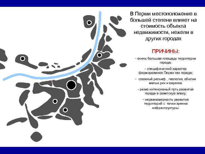 В Перми местоположение в большей степени влияет на стоимость объекта недвижимости, нежели в других городах ПРИЧИНЫ: - очень большая площадь территории города; - специфический характер формирования Перми как города; - сложный рельеф , геология, обилие малых рек и оврагов; - резко интенсивный путь развития города в советскую эпоху; - неравномерность развития территорий с точки зрения инфраструктуры.