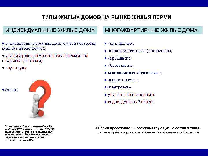 ТИПЫ ЖИЛЫХ ДОМОВ НА РЫНКЕ ЖИЛЬЯ ПЕРМИ ИНДИВИДУАЛЬНЫЕ ЖИЛЫЕ ДОМА МНОГОКВАРТИРНЫЕ ЖИЛЫЕ ДОМА ● индивидуальные жилые дома старой постройки ● «шлакоблок» ; (хаотичная застройка); ● «полногабаритные» ( «сталинки» ); ● индивидуальные жилые дома современной ● «хрущевки» ; постройки (коттеджи); ● «брежневки» ; ● таун-хаусы; ● многоэтажные «брежневки» ; ● «серая панель» ; ● «ленпроект» ; ● «дачи» ● улучшенная планировка; ● индивидуальный проект. Постановление Конституционного Суда РФ от 30 июня 2011 г. (пересмотр статьи 1 ФЗ «О В Перми представлены все существующие на сегодня типы садоводнических, огороднических и дачных жилых домов пусть и в очень ограниченном числе серий некоммерческих объединениях граждан» : стала возможна прописка на землях сельхозназначения и ЛПХ
