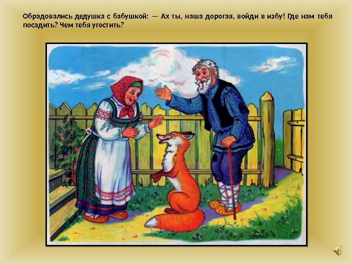 Обрадовались дедушка с бабушкой: — Ах ты, наша дорогая, войди в избу! Где нам тебя посадить? Чем тебя угостить?