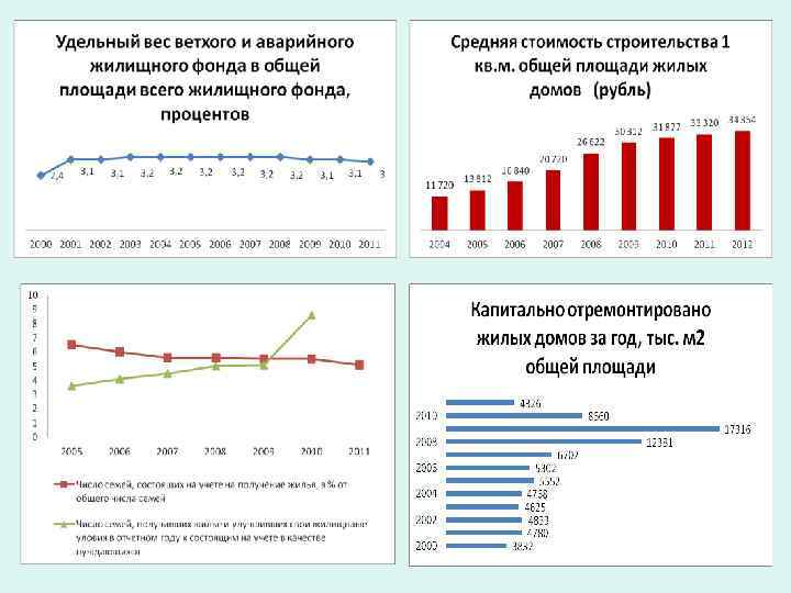 Количественные показатели • Жилой фонд общей площади жилых помещений; • Число семей, получивших жильё; • Общая площадь жилых помещений, приходящаяся в среднем на одного жителя; Качественные показатели • Число семей, улучшивших свои жилищные условия; • Капитально отремонтировано жилых домов; • Уровень благоустройства жилищного • фонда;