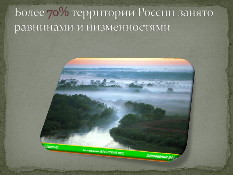 В России 40% от всей её площади (17.075.400 км².) занимают Леса ! Это 1/5 всех лесов мира и половина мировых хвойных лесов. Соответственно животный мир, обитающий в лесах, довольно разнообразен — здесь обитают и белые медведи, и моржи, и тигры, и леопарды, и прочие звери. В России более 120 тысяч рек и около 2 млн. озёр. musc